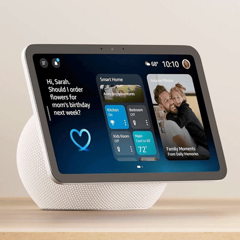 El nuevo Echo Show 8 incluye una pantalla de 8.7” y una cámara de 13MPX con autofoco. En el puedes ver las noticias y el clima de un vistazo, hacer videollamadas, consultar el video de cámaras compatibles, reproducir música y series, entre otras cosas, acepta comandos de voz con Alexa,